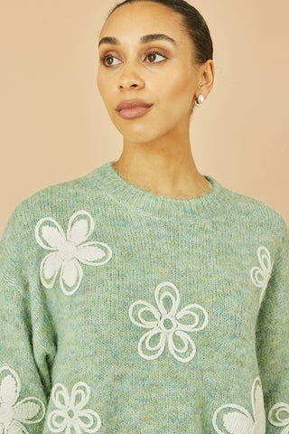 Green Relaxed Knitted Jumper With Crochet Flowers