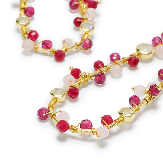 Boucles d'oreilles Hydra en forme de grande larme, serties de pierres précieuses : pierre de lune, quartz rose, jade rose et tourmaline rose
