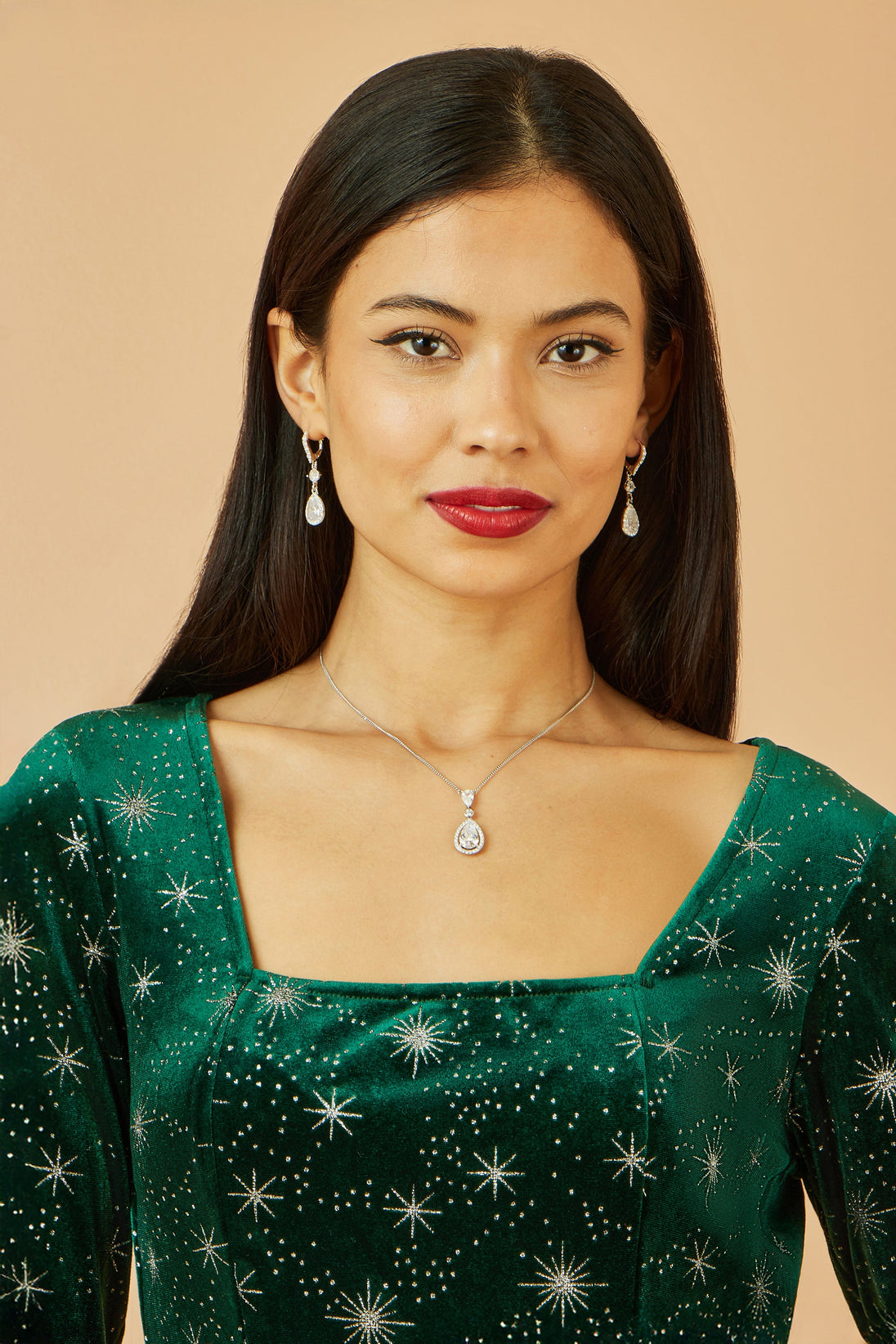 Capturez la beauté du ciel nocturne dans cette robe patineuse verte à manches longues. Son encolure carrée, sa coupe évasée et son magnifique velours sont à la fois glamour et d'une douceur incomparable. L'imprimé constellations apporte une touche d'éclat unique aux fêtes de fin d'année et sublimera vos tenues de soirée de Noël, notamment avec des chaussures et accessoires argentés.