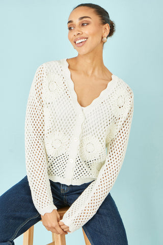 This white crochet-knit cardigan features a delicate open-mesh design with a classic V-neckline and button-down front. It is characterized by tonal, circular floral motifs integrated into the knit and finished with feminine scalloped edges along the neckline, placket, and cuffs.