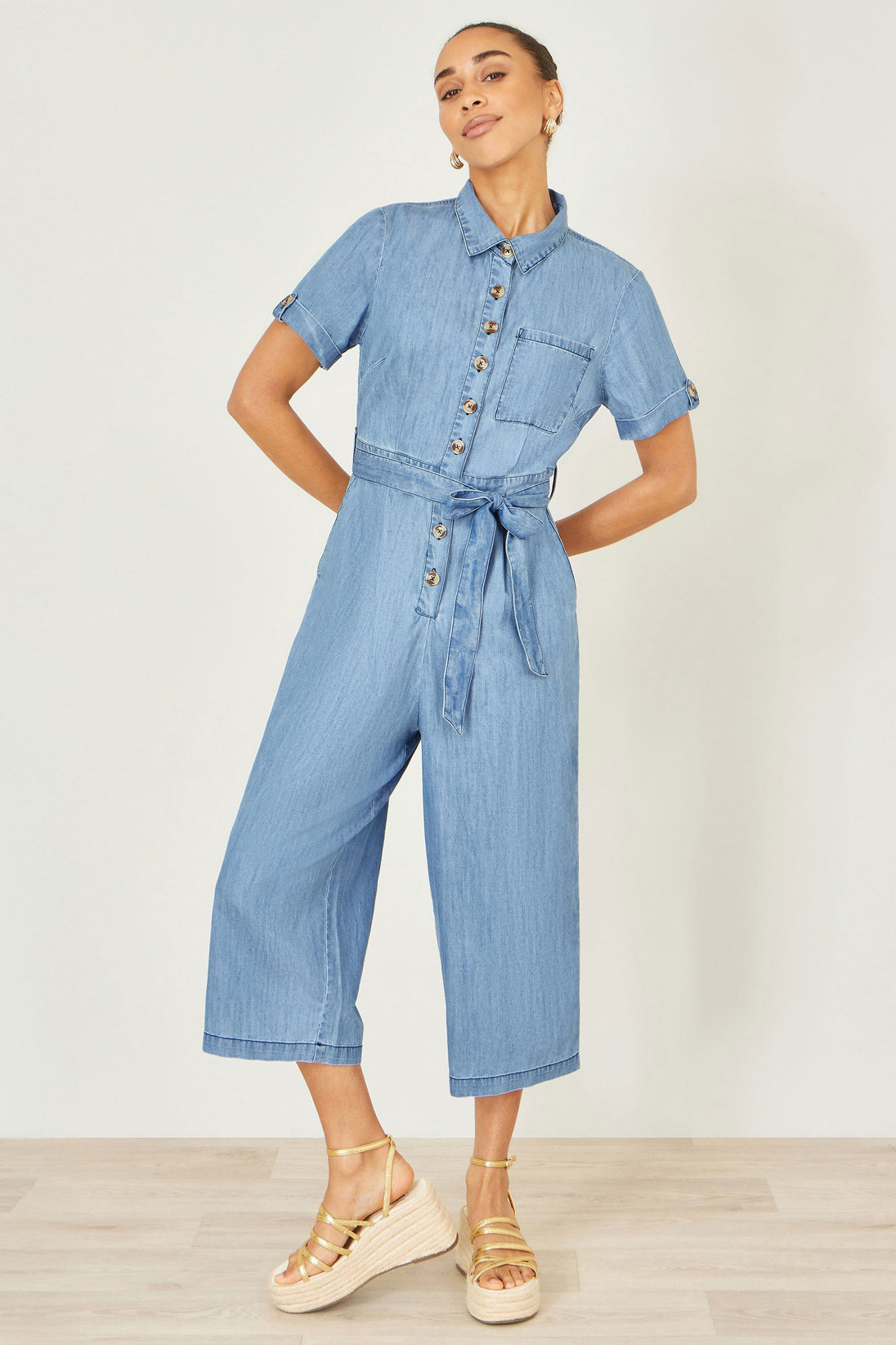 It’s lightweight, it’s contemporary, it’s our Yumi Light Denim Button Jumpsuit. Expertly crafted from pure cotton, the chambray jumpsuit is lightweight and flowing. With a semi-fitted shape enhanced by a waist tie, buttons run down the front and pockets sit on the side for practicality. The flared culotte trousers means you’ll feel comfortable at all moments of the day.