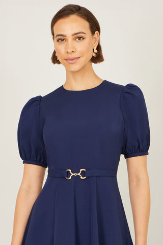 - Yumi Navy Skater Dress With Puff Sleeves And Buckle Detail